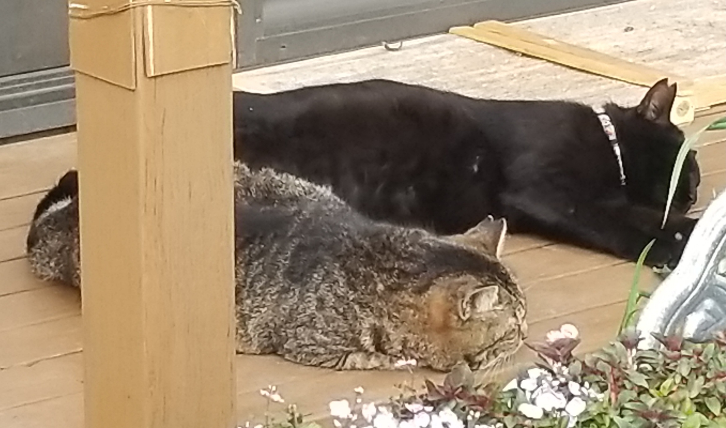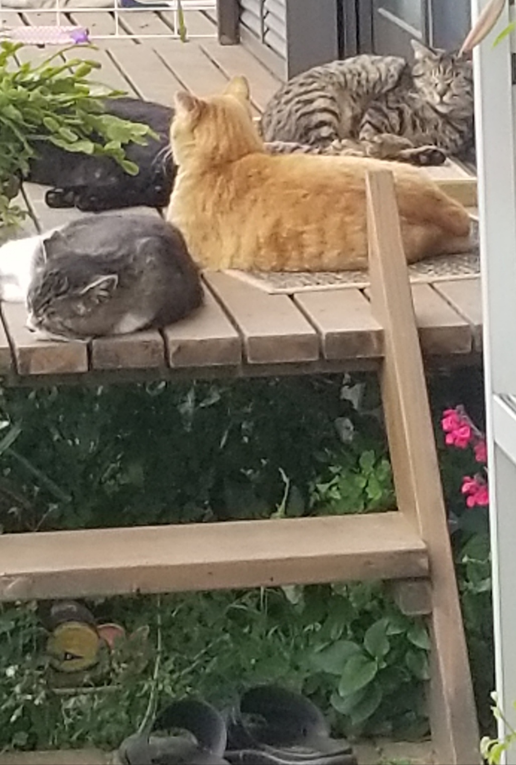 庭の南側、ウッドデッキに暮らす4匹の猫たち。