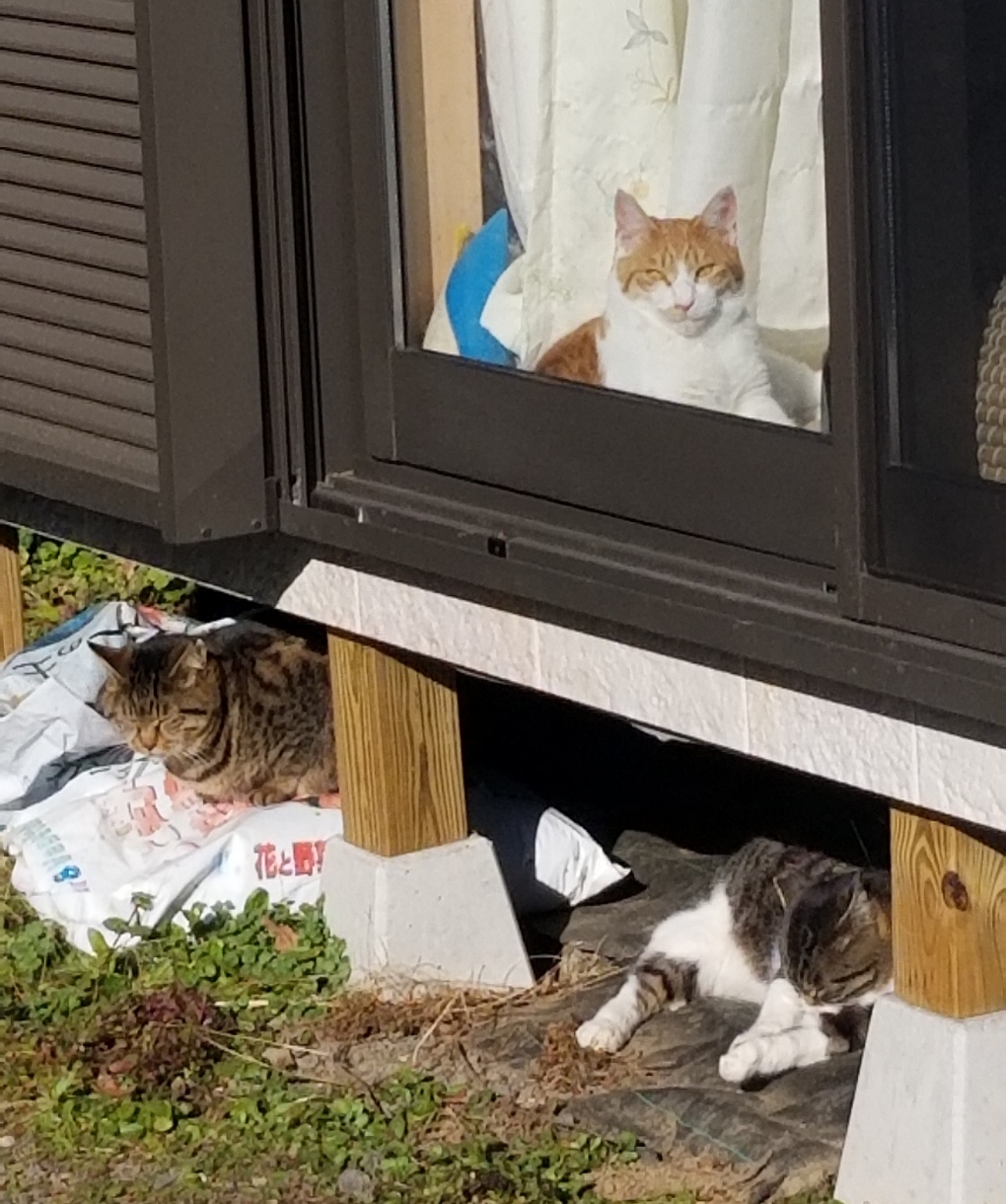 落ち着かない庭に定住組の4匹。