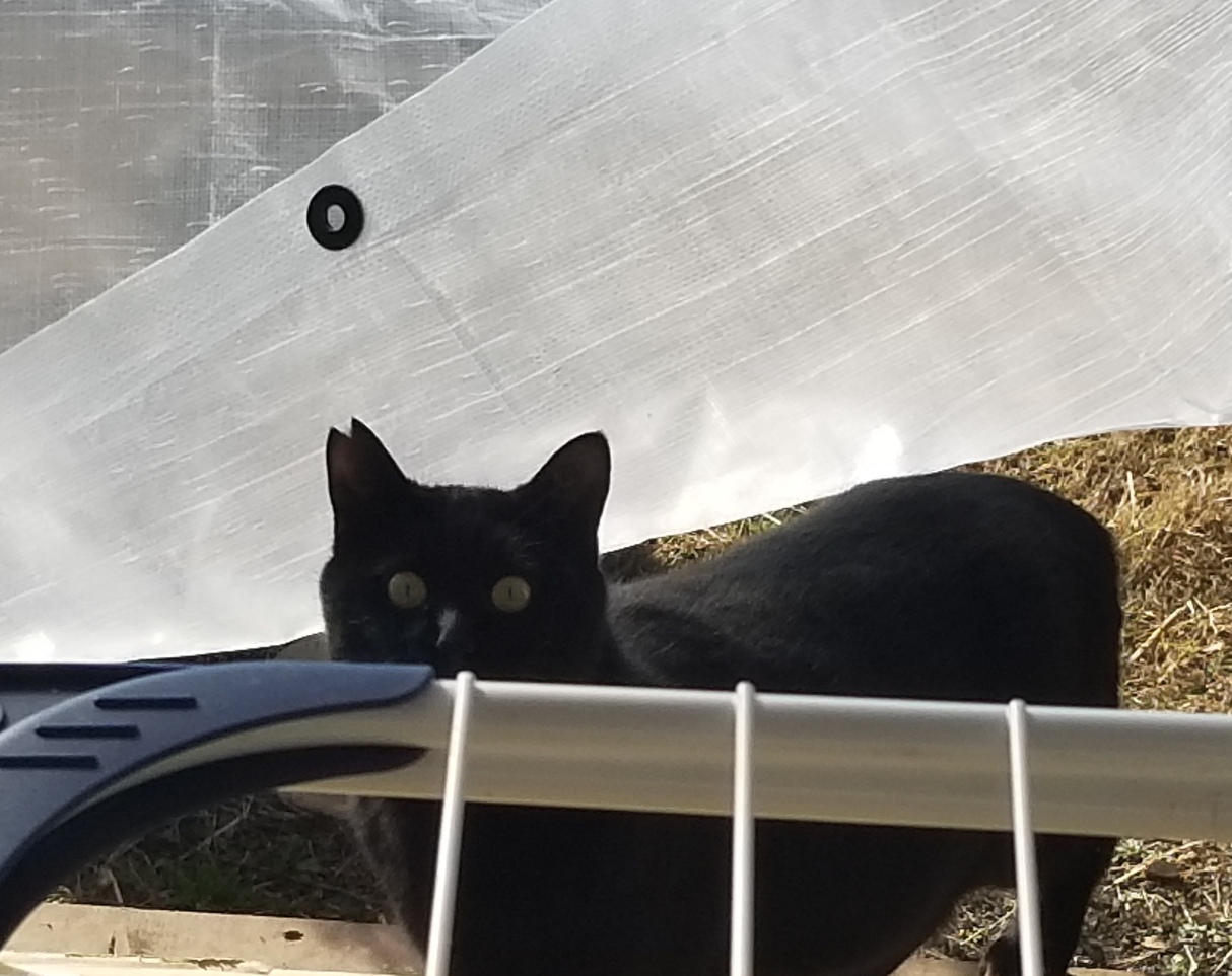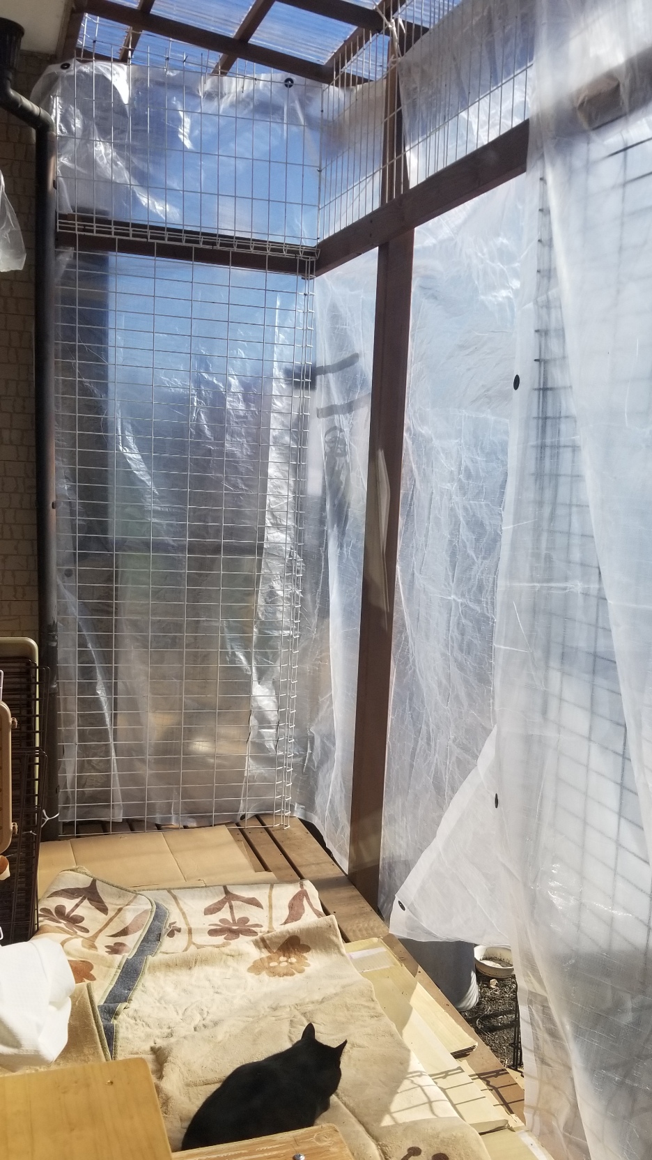 昨日はウッドデッキの外猫スペースに透明のビニールシートを張り巡らして