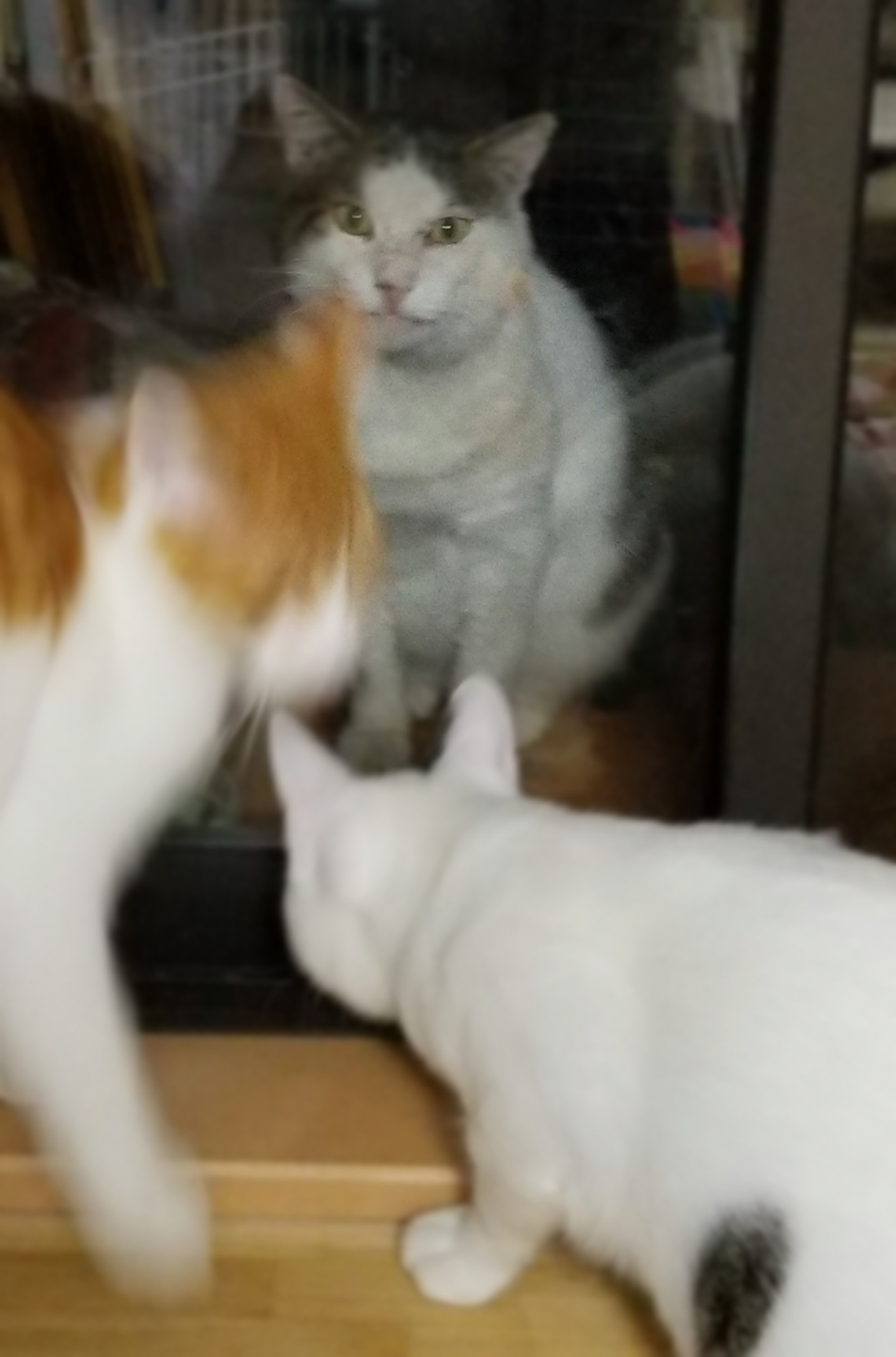 夜保護猫部屋の窓越しに
