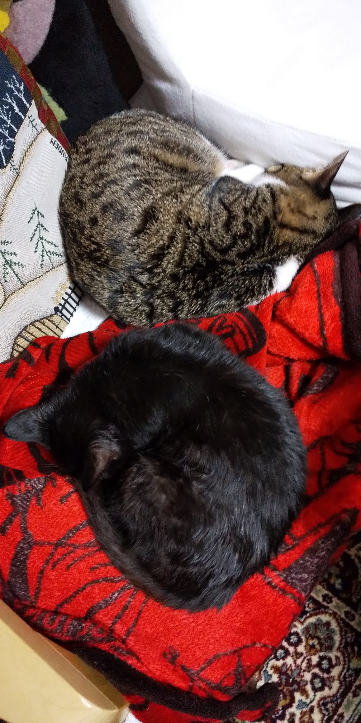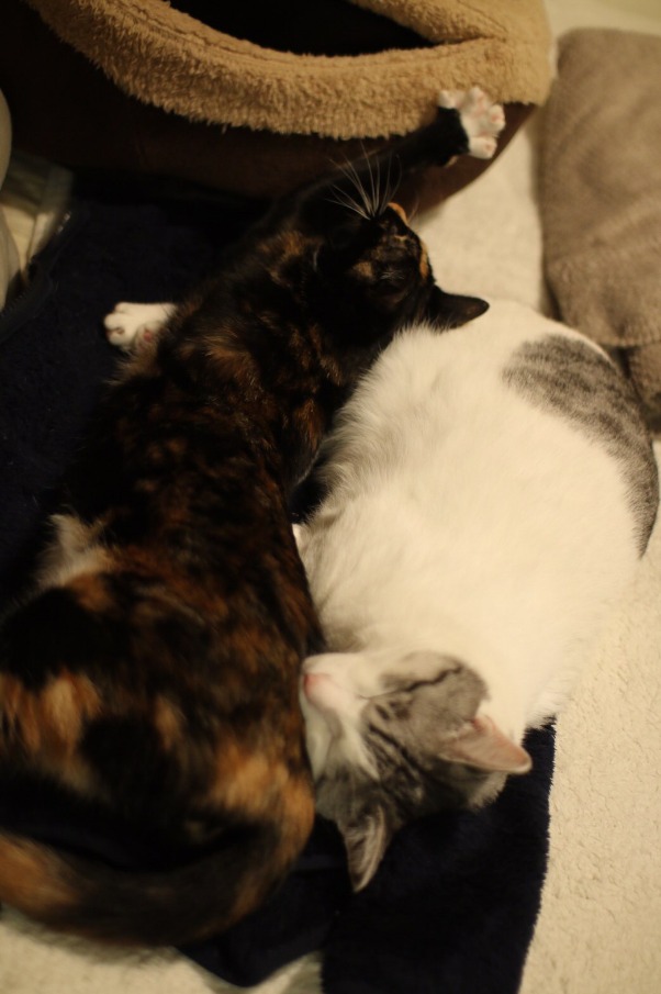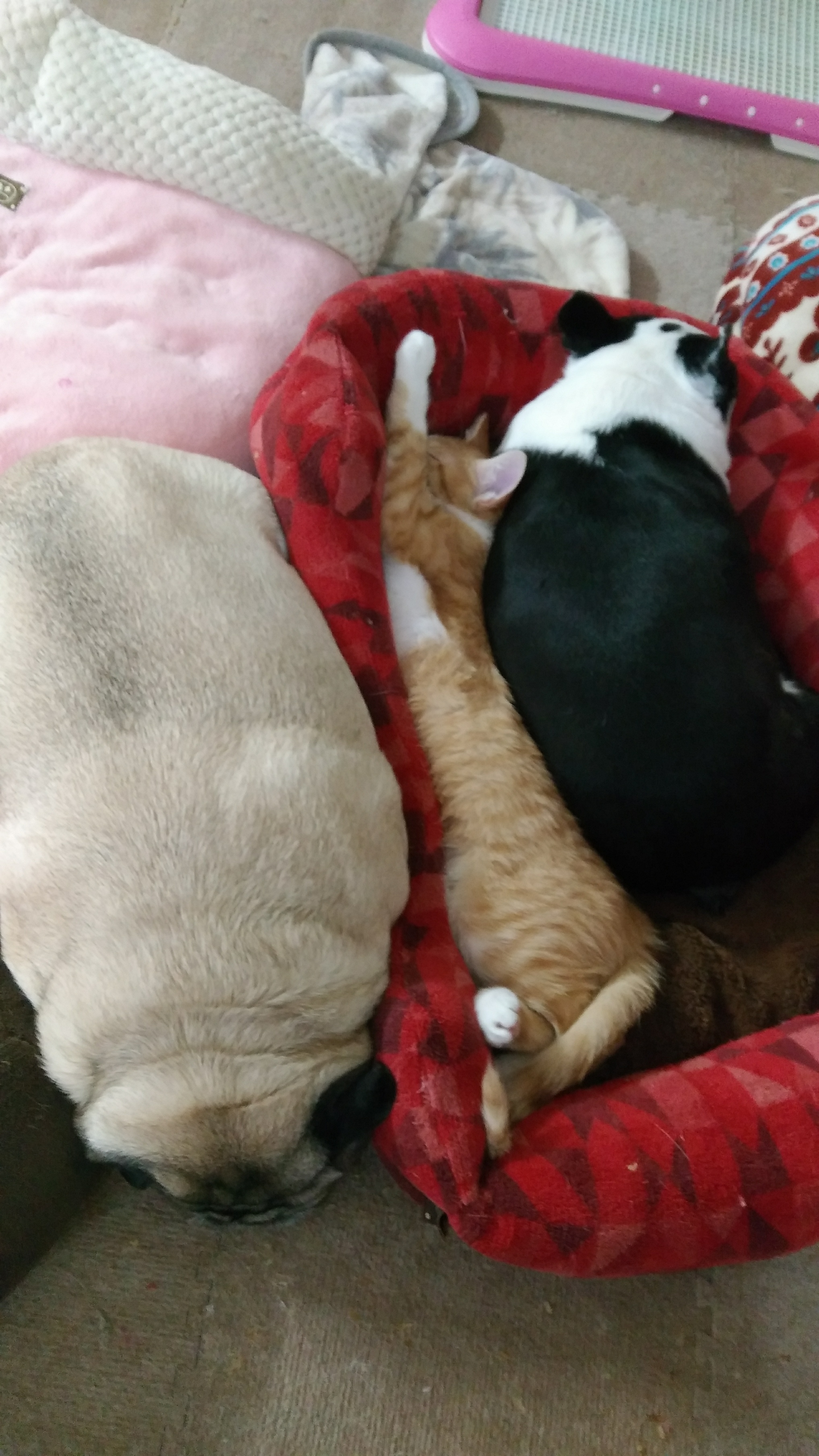 ポン太くんに後ろからハグされて眠っていますね。な~んて素敵なんでしょう!!