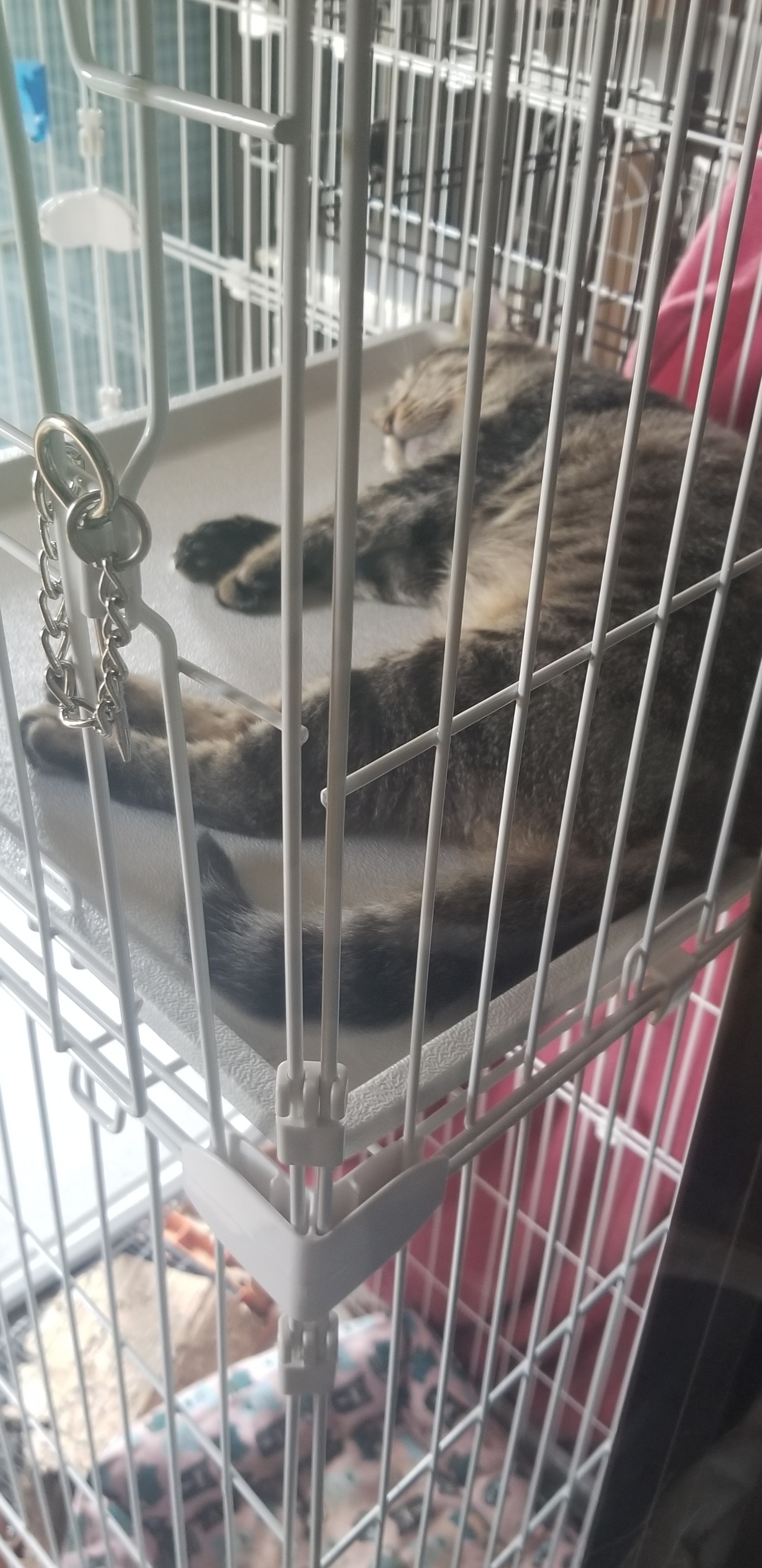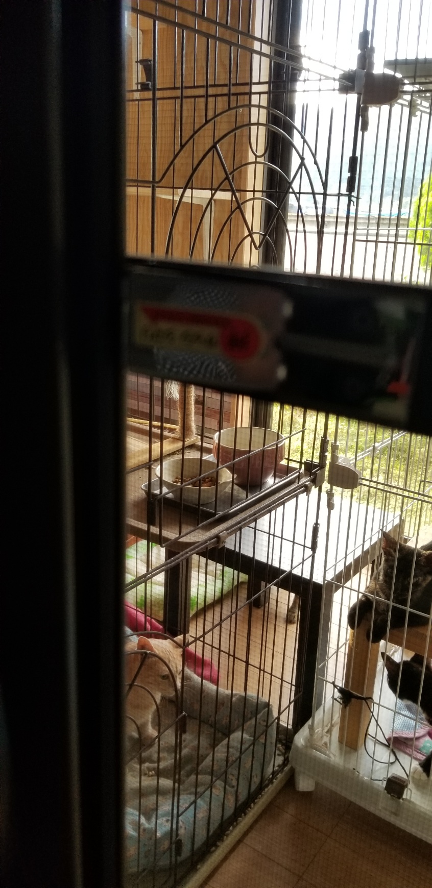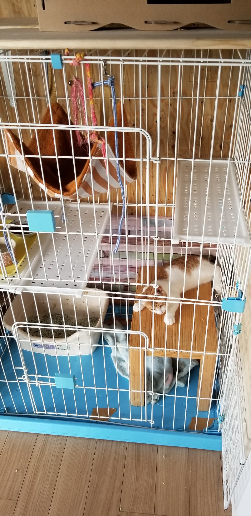 猫部屋を増築工事して、その間は2台連結した3段ゲージに入れていました。