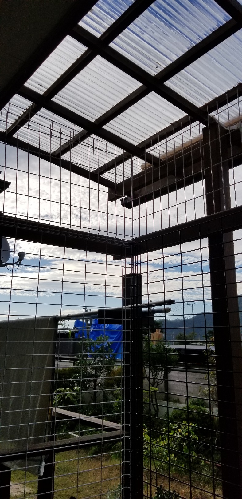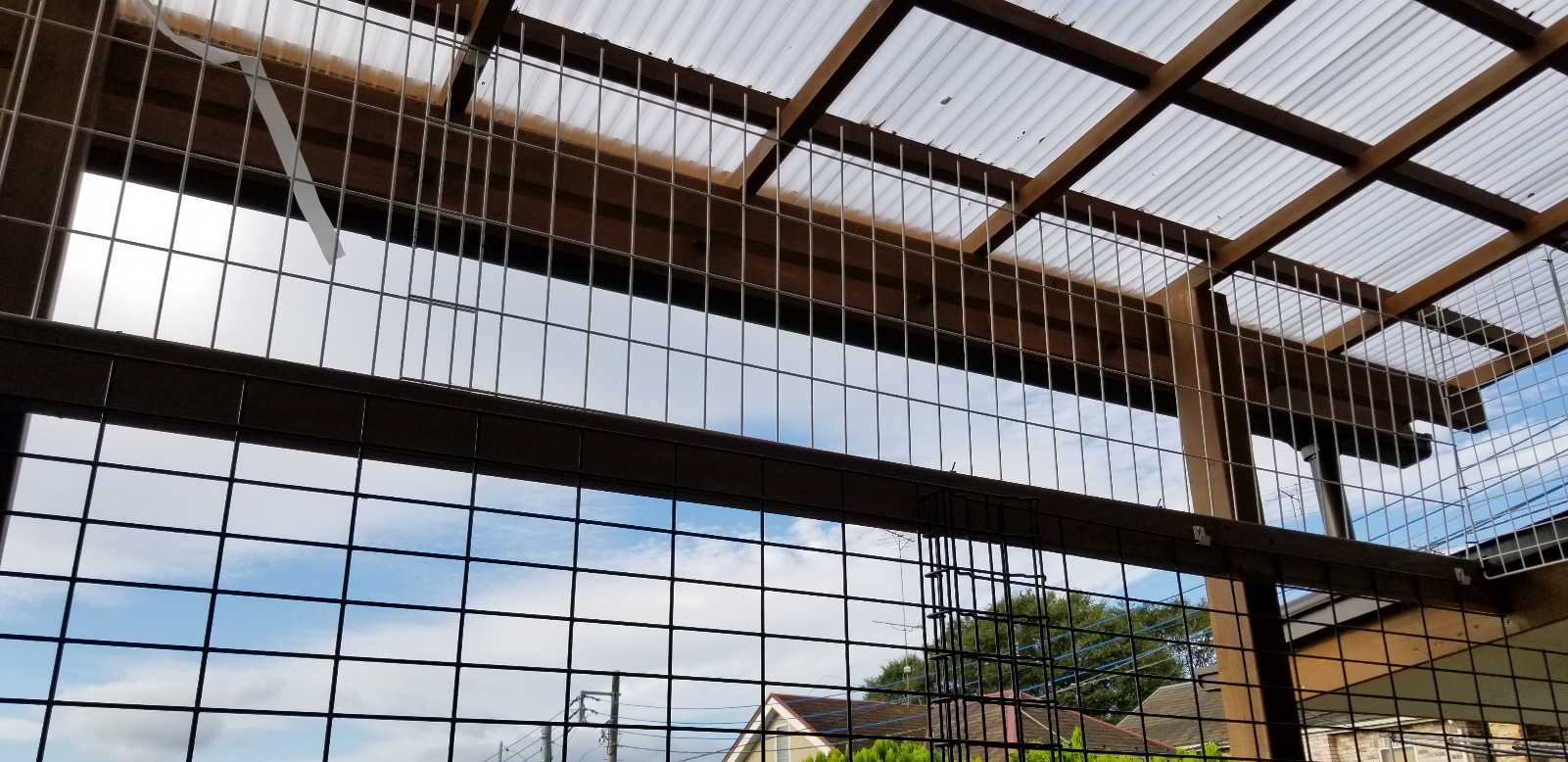 土曜午前はメッシュフェンスをウッドデッキに取り付けて、上部にも脱走されないようフェンスを切断して取付。