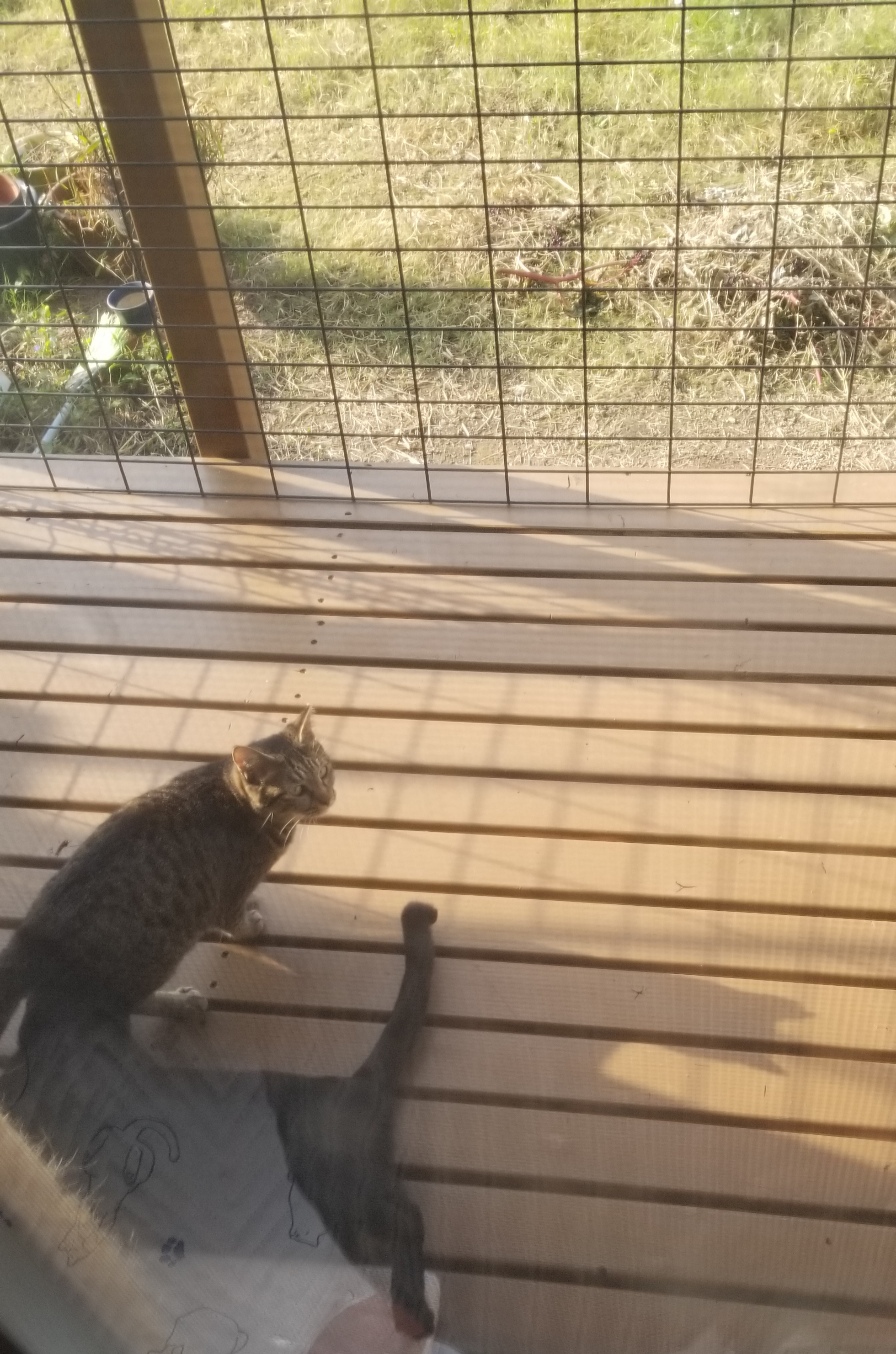 2つのゲージを連結して6月に遺棄されたロッキーとビビアンを入れていましたが、この子達はウッドデッキに自由に出入りでき外の空気を味わえます。