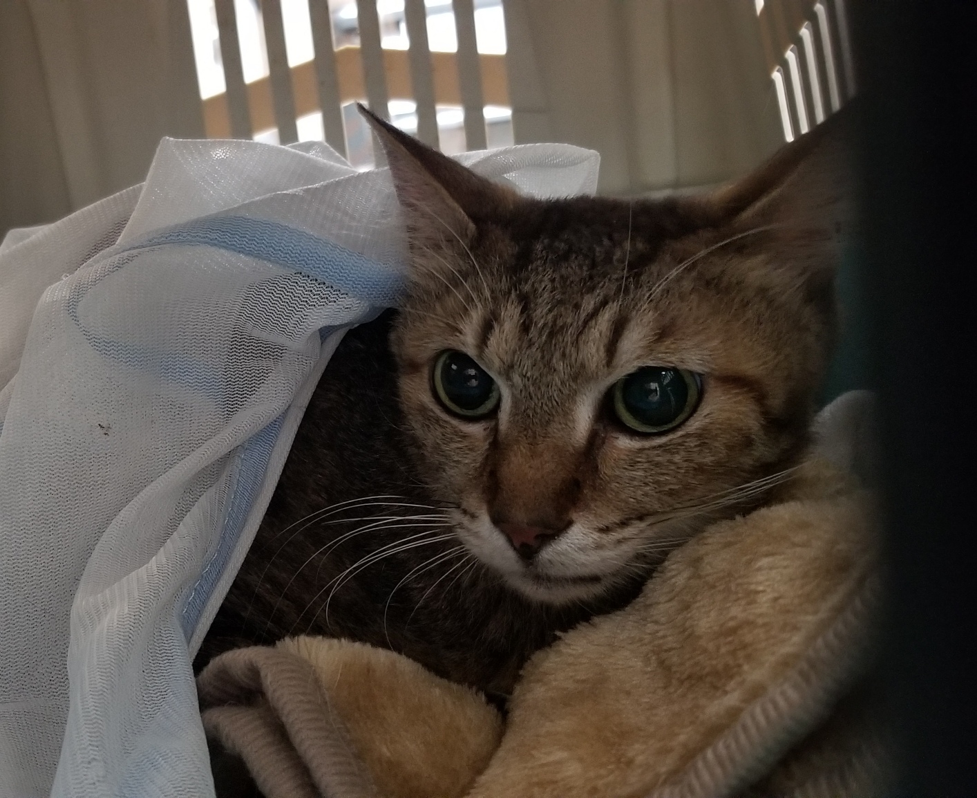 洗濯ネットでそ~~~っと、でも気づかれ逃げられ、ようやくキャリーに入れられました。