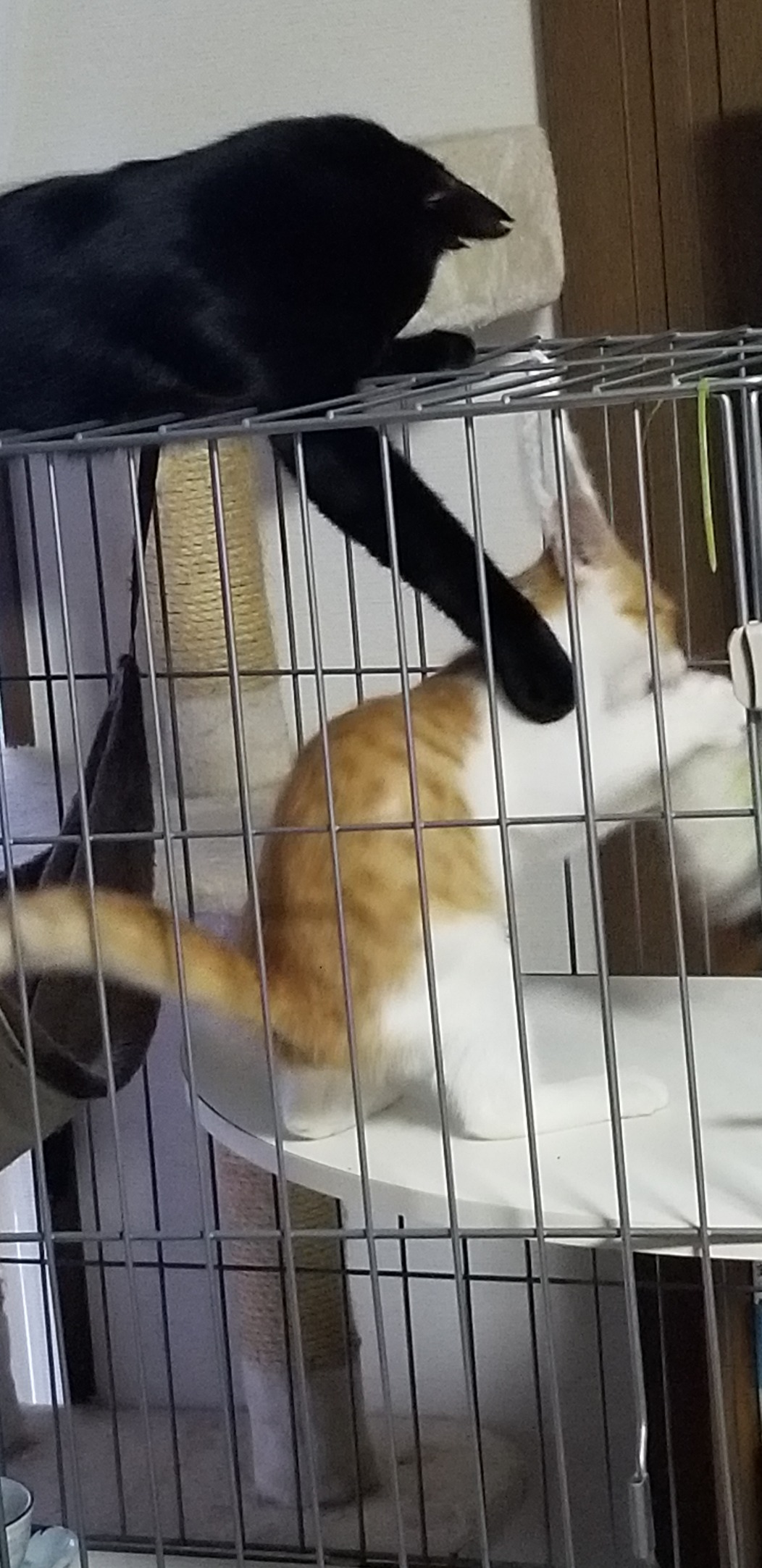 ゲージの最上段でお腹出して寝ているロッキーに警戒しているビビアン。