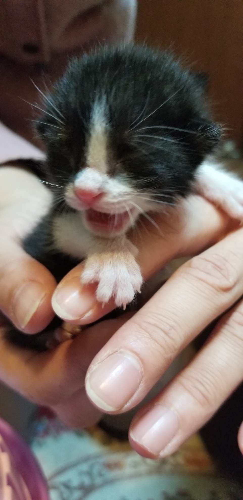 4月5日夜に保護した白黒鉢割れくんは、おそらくママ猫が一番最初にくわえて