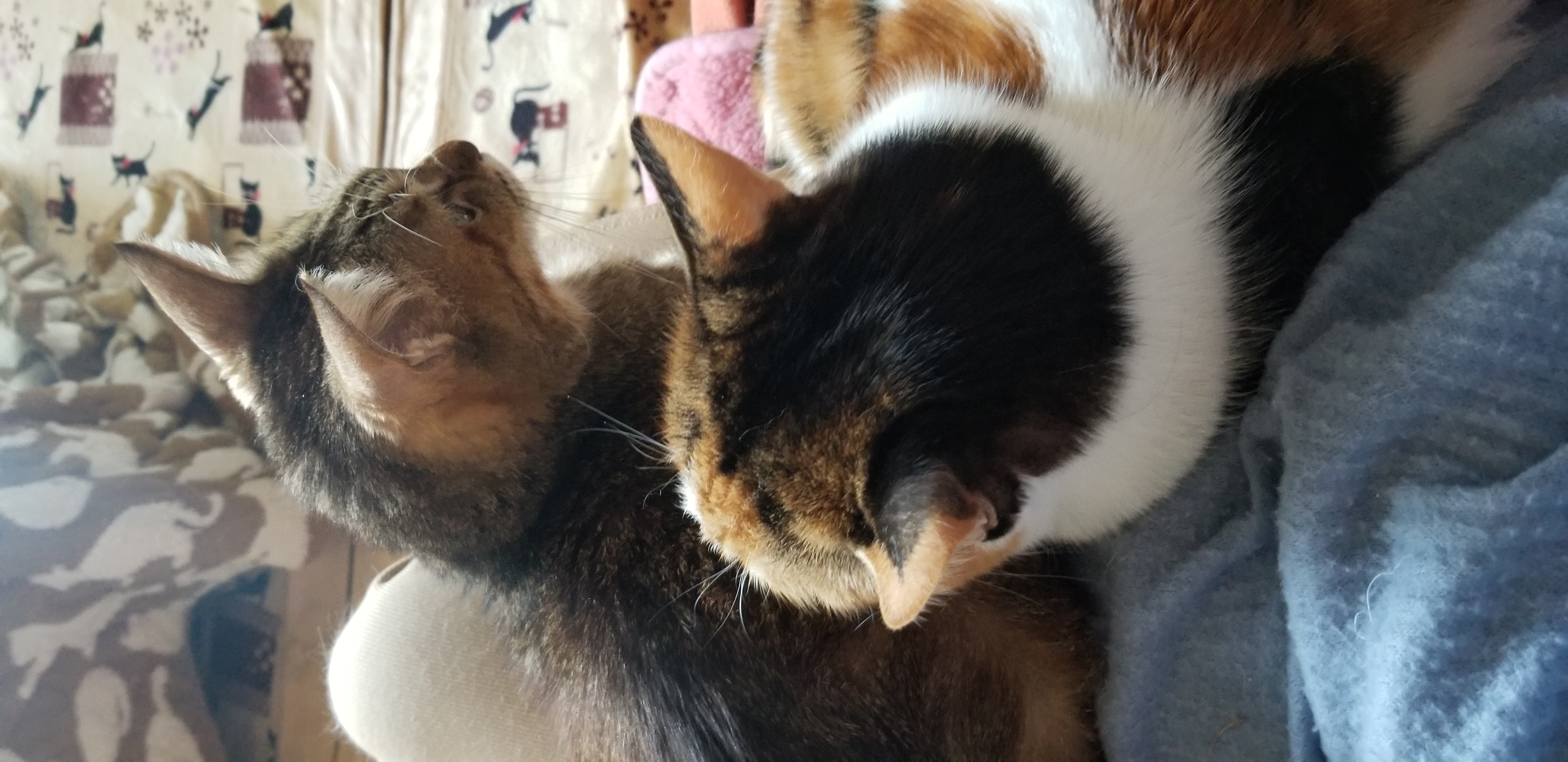 陽だまりで寄り添う琥珀になるちゃんにげんちゃん