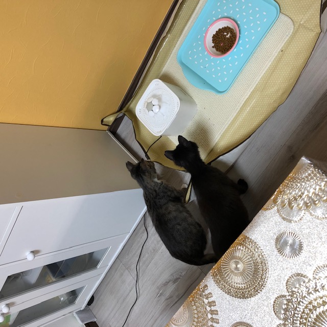 電動給水機にびっくり夢中なのはトラミちゃん、クロ太君兄妹。
