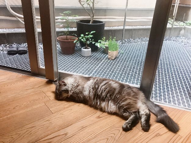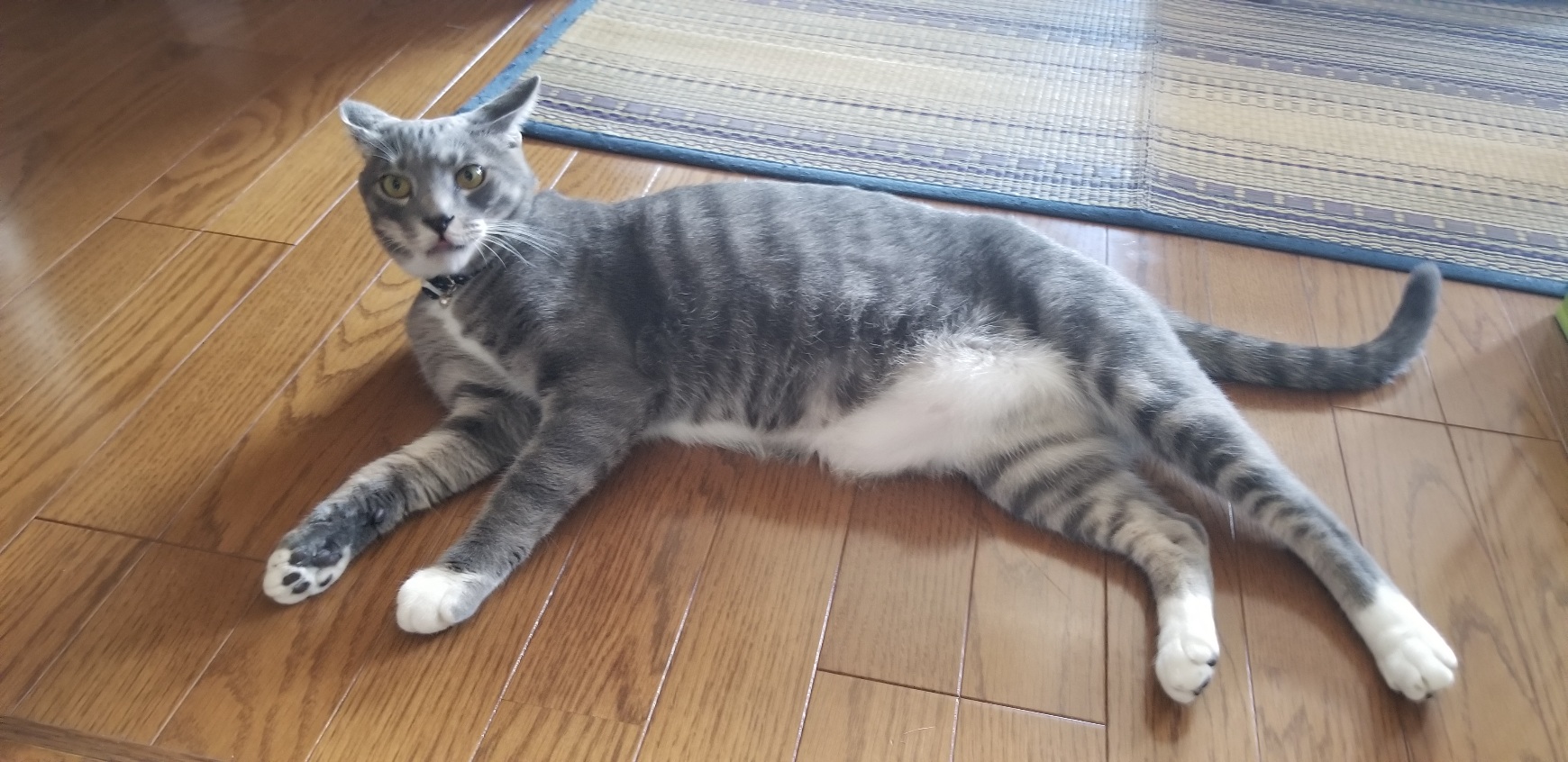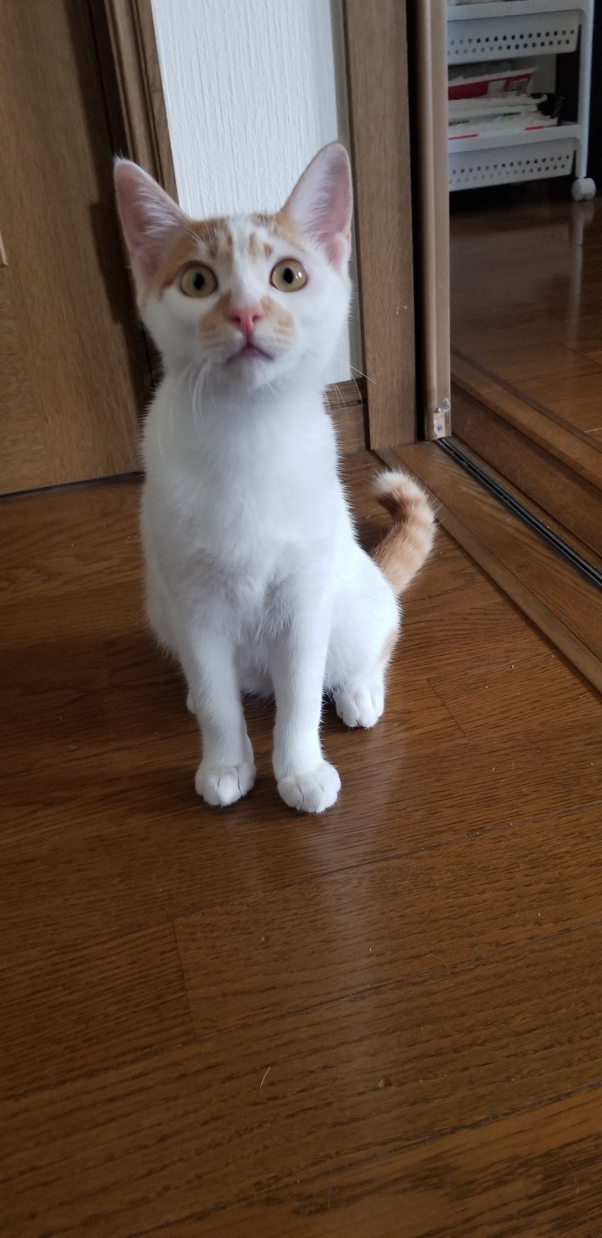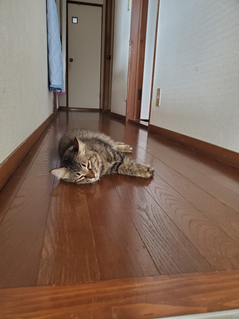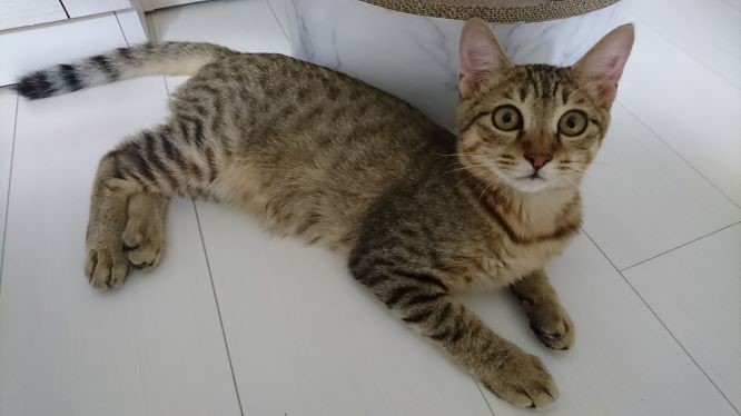 こたろうくん、白いフローリングと毛並みのキジ柄が映えて素敵ですね!