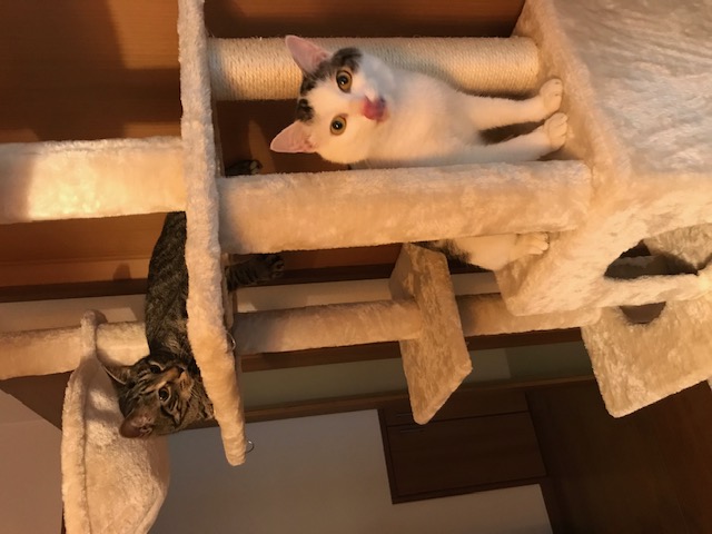 新しく買ってくださった巨大キャットタワーで早速くつろぐりくくん、そらくんです。
