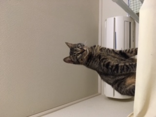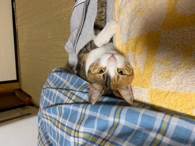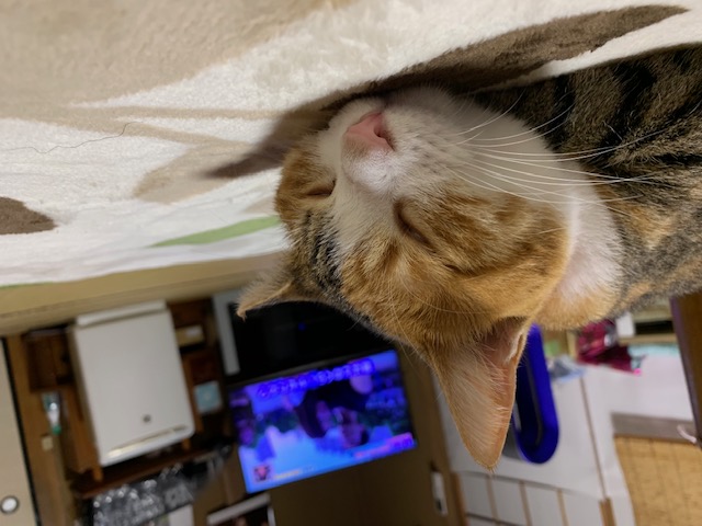 2階廊下に避難所を設けて猫たちが逃げられるようにしましたが、なるちゃん、げんちゃん以外はこたつに入り、のんちゃんは接待していました。