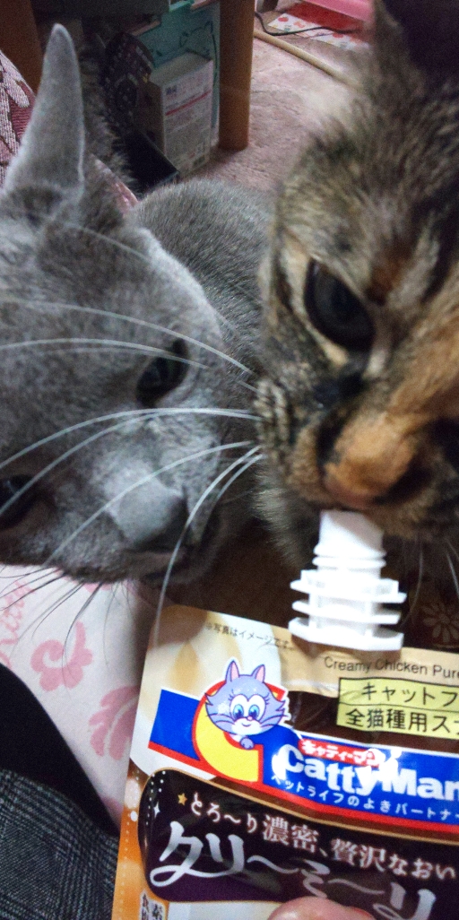 茶々ちゃんにプリンちゃん、女子同士まだ親友にはなれていませんが、おいしいものには目がない(笑)
