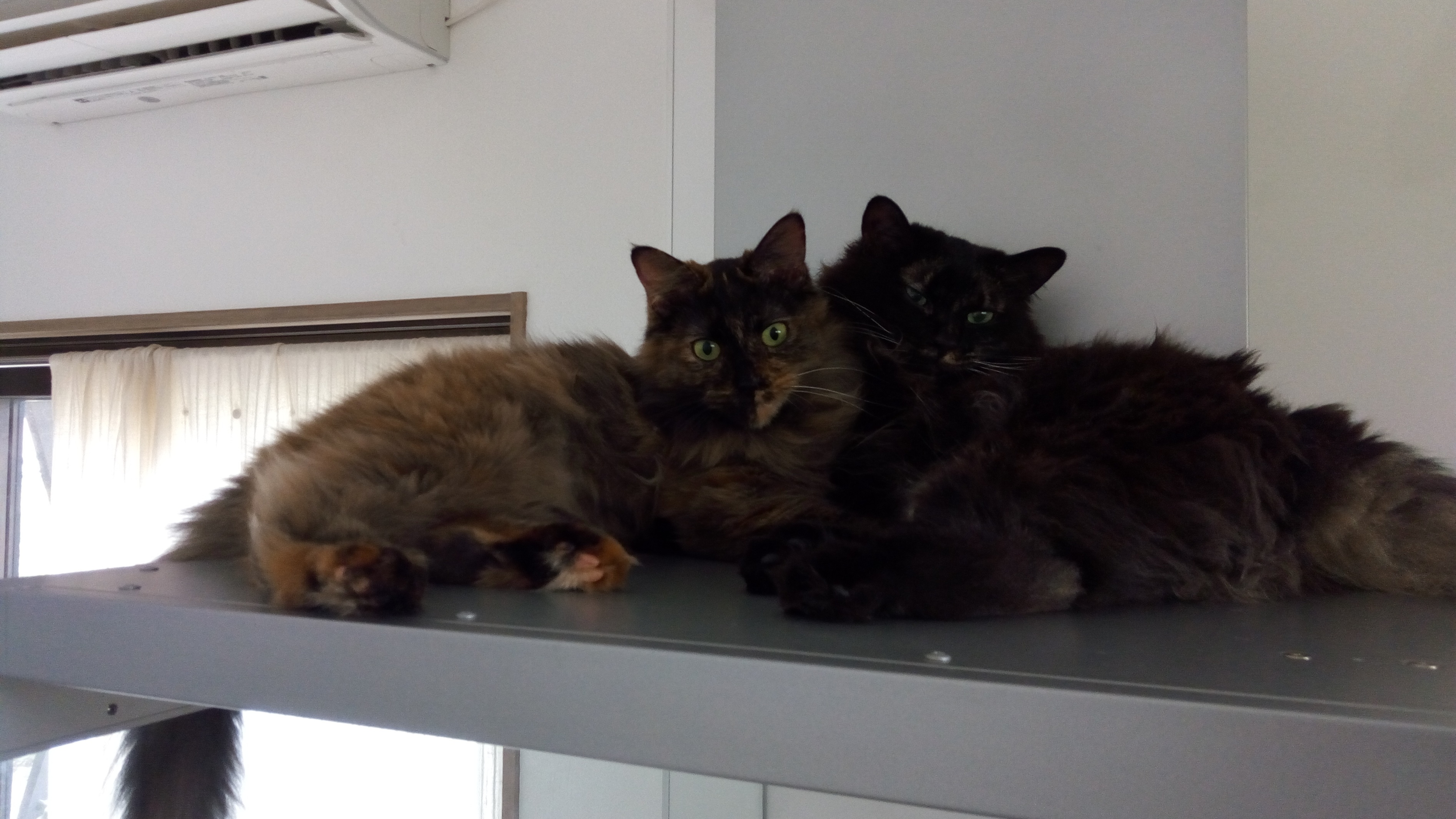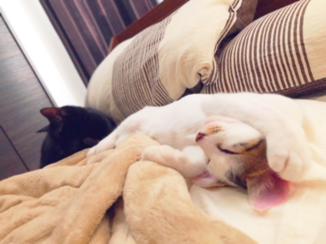 アンジュちゃんにかいくんは先住のジュリアちゃんの目を盗んでは彼女の縄張りのベッドでお昼寝! 視野の中にはいつもジュリアちゃんがいるようです(笑)怒られちゃうんですって!