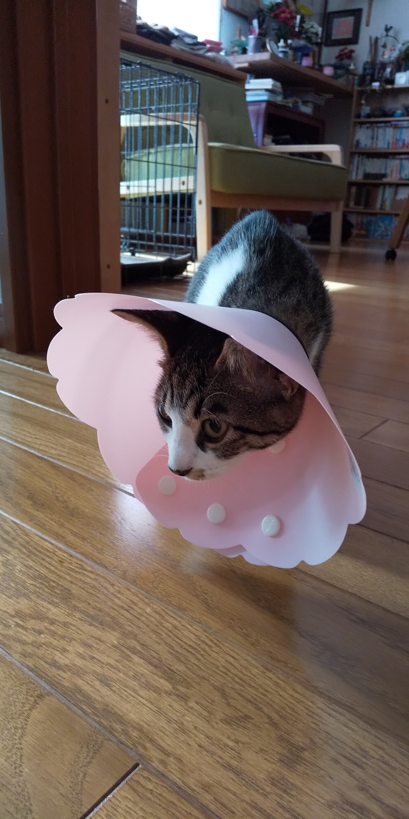 可愛いエリザベスカラーですが当の本猫には邪魔で仕方ないでしょうね。