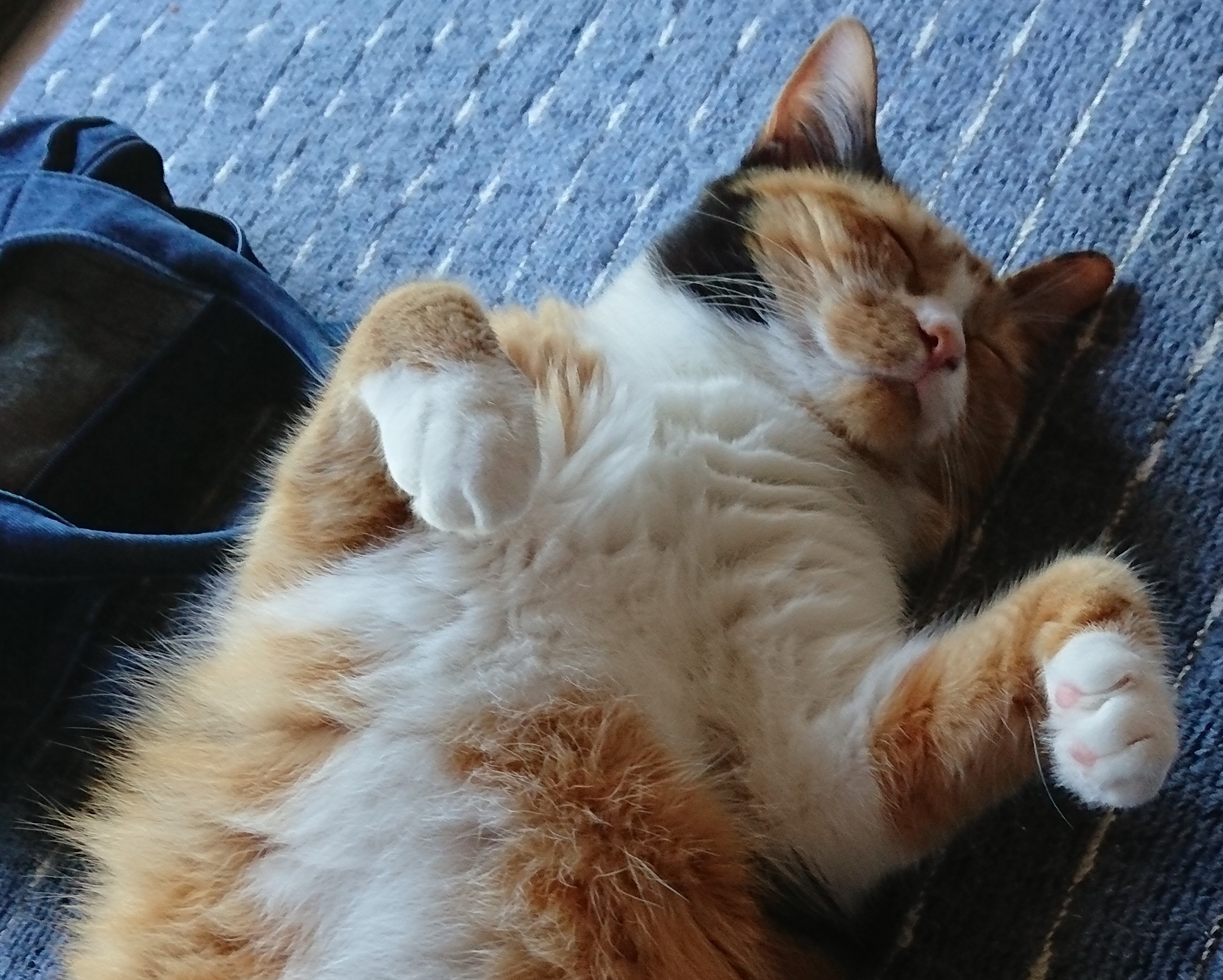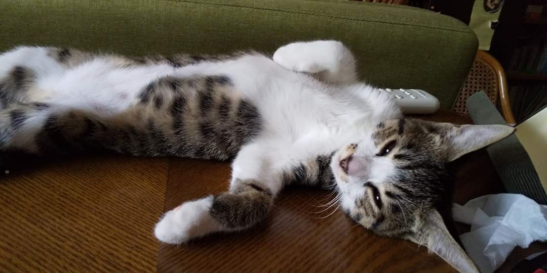 保護された三毛ちゃんも診察台の上でゴロゴロだったそうですが、この子もゴロンとお腹を出していました。