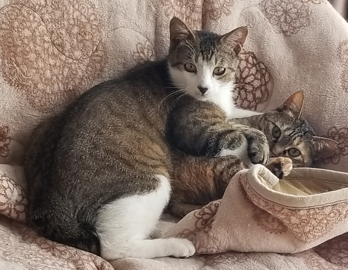 三毛ママと茶白の男の子。子猫は生後2か月です。