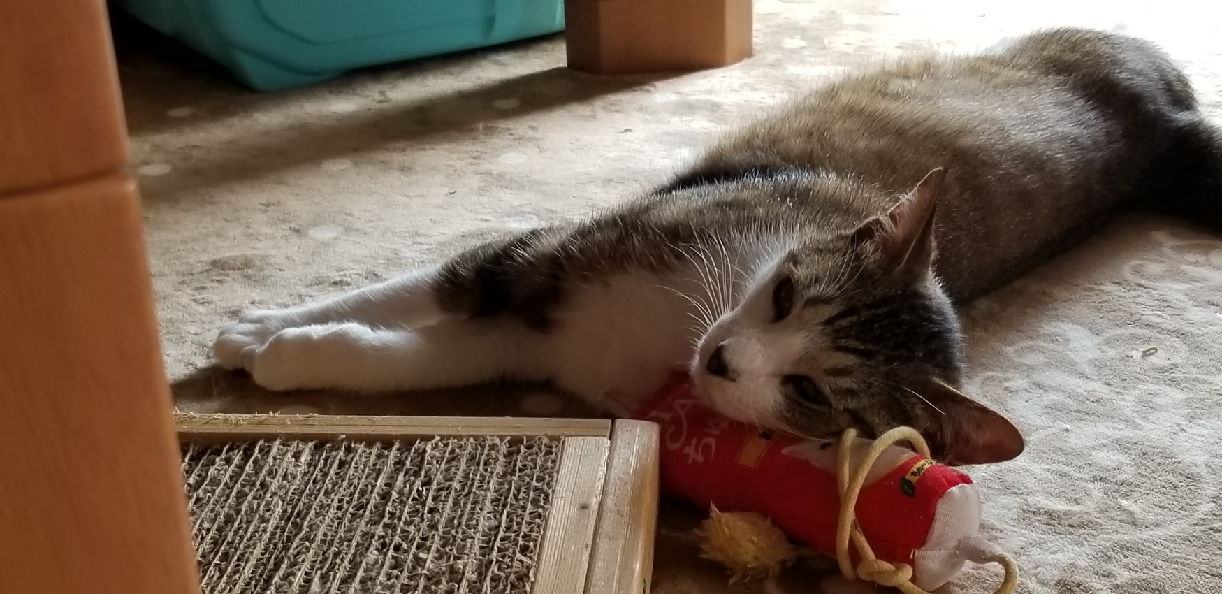 ちゅーるキッカーを枕にしてウトウトするまるくん。