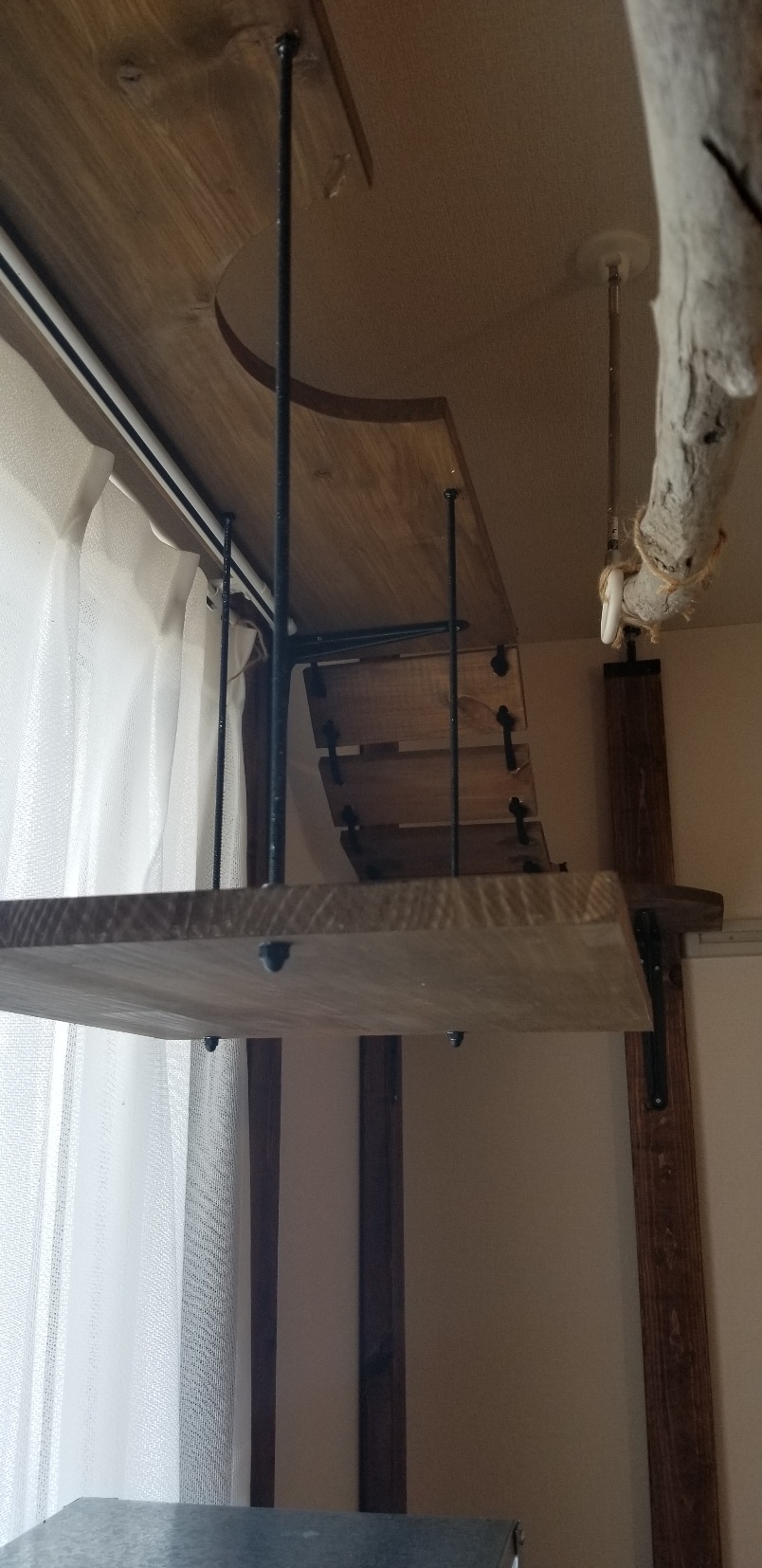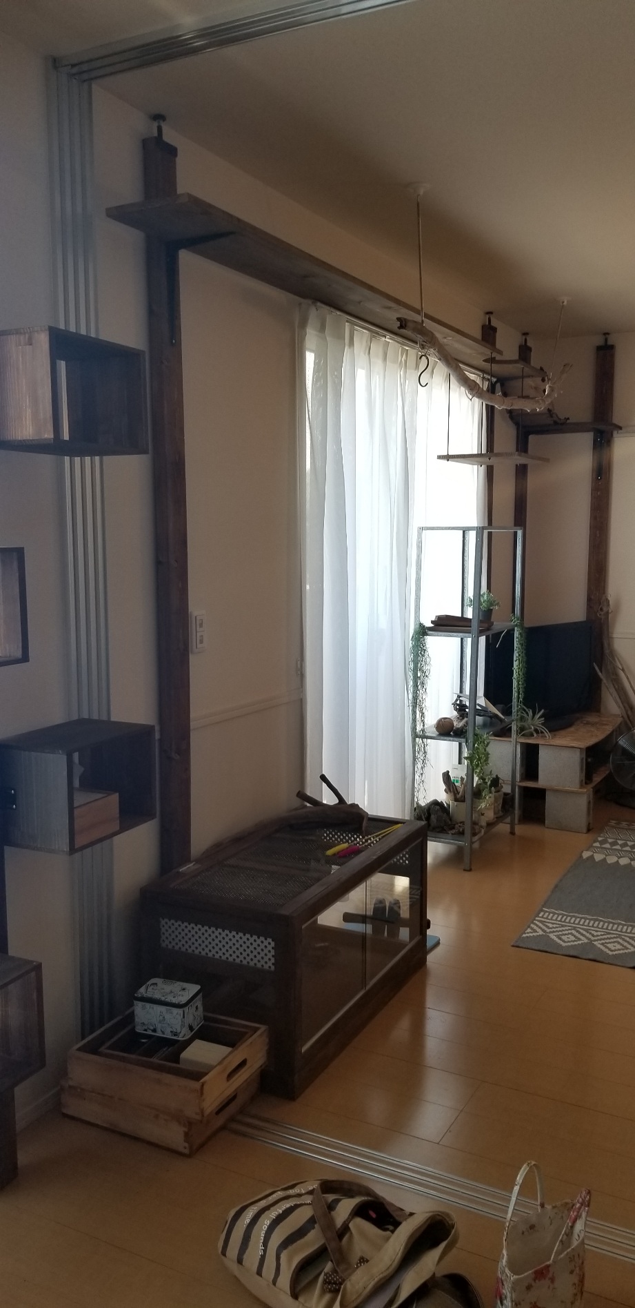 天井と床に突っ張り式のディアウォール(たぶん)を使って受け木の2×4材を固定しています。