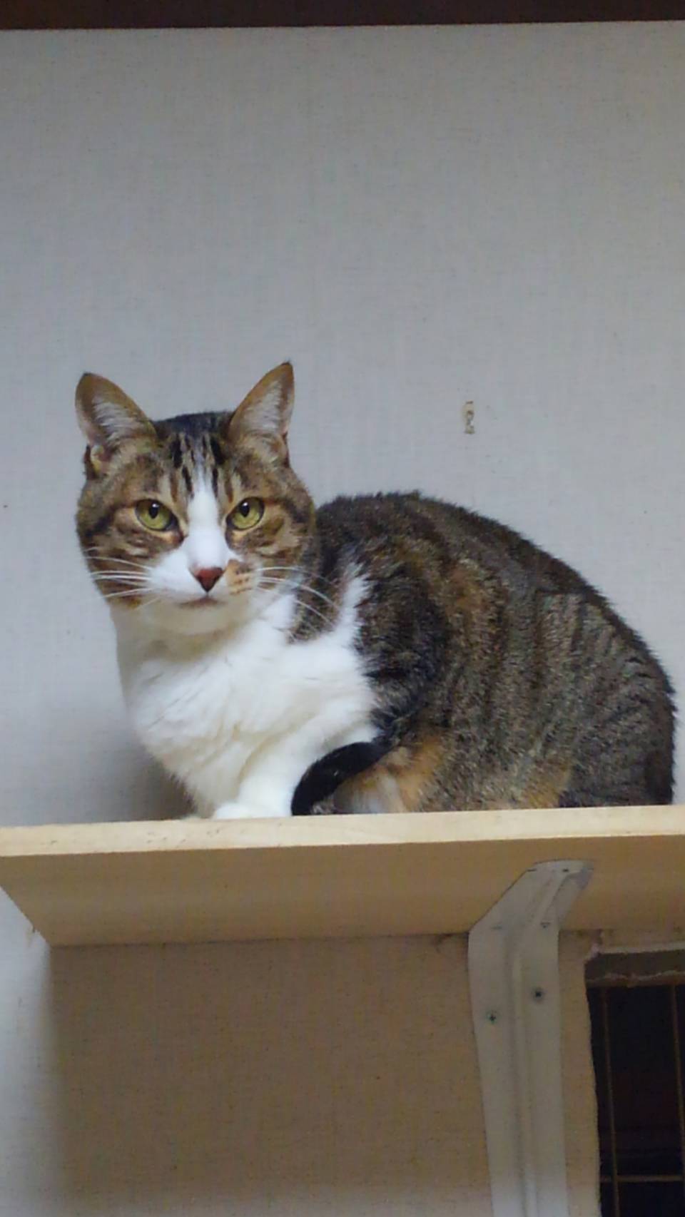 2階のころすけ、ちゃこ、茶色君のへや(ドアを開けています)のキャットタワーの丸く繰りぬかれた出入り口に片手と首をだしてもたれかけていました。