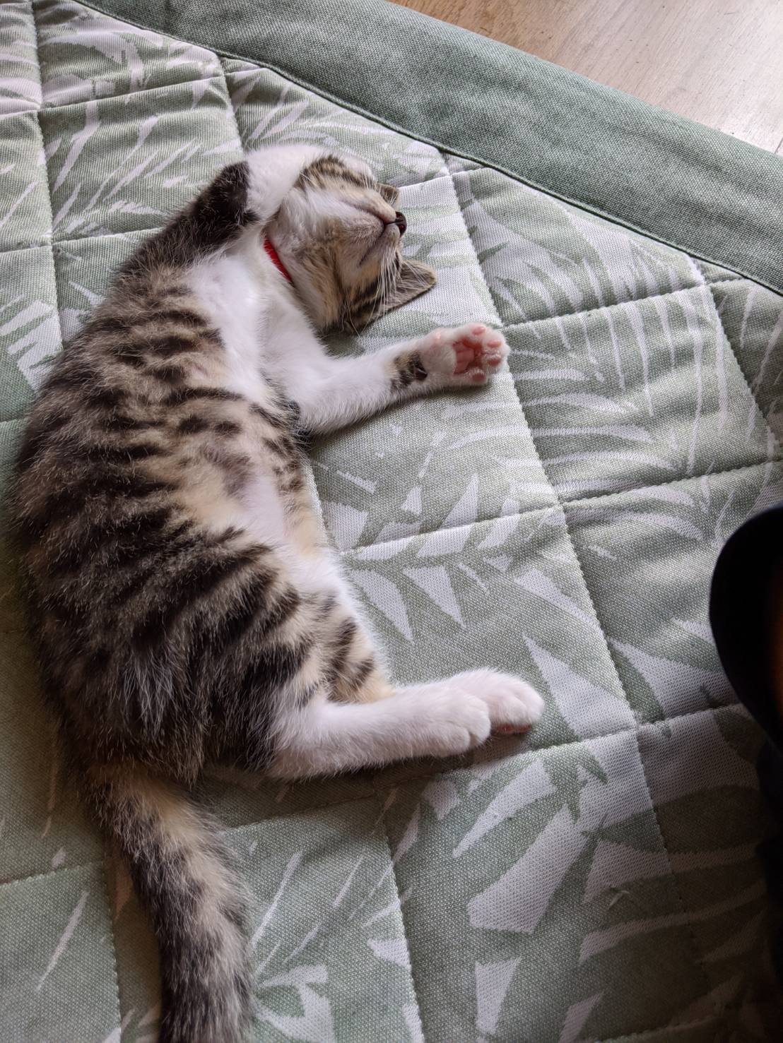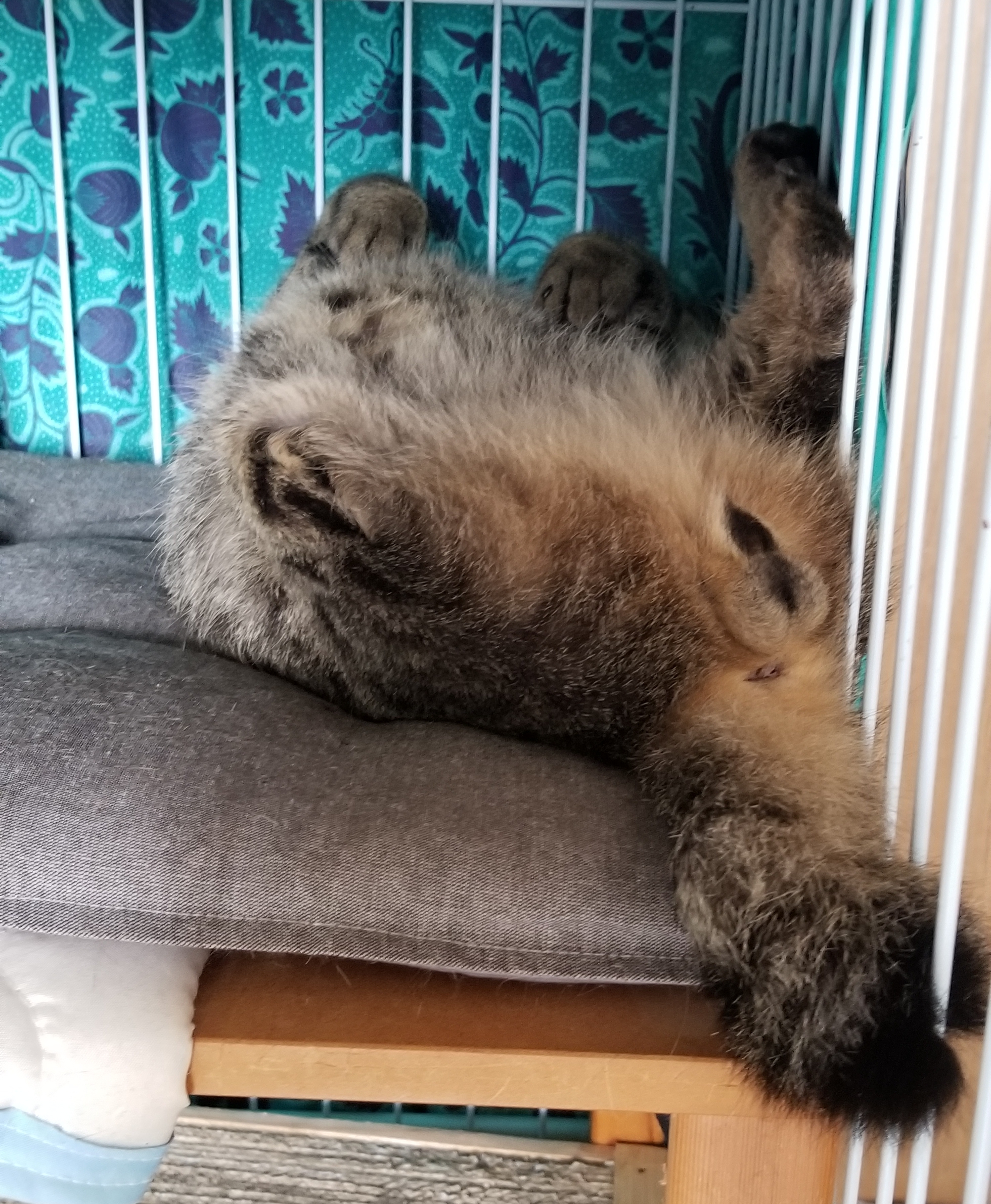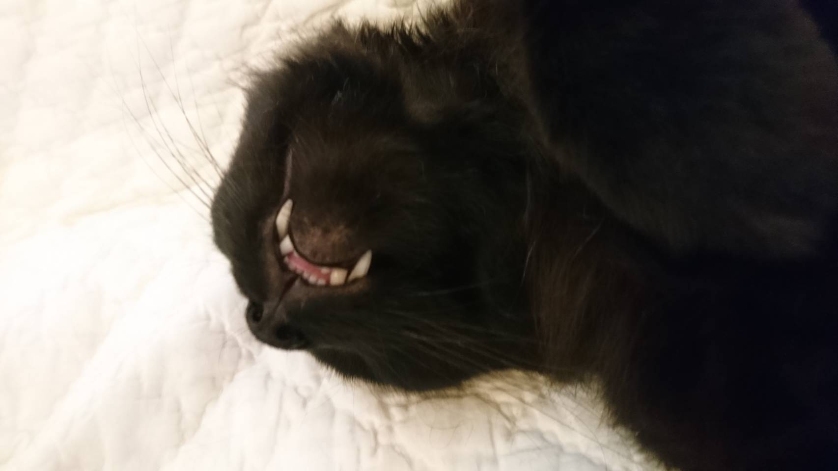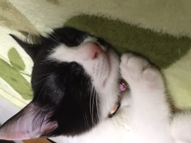 昨夜は保護猫部屋では仁くんが、隣のリビングでは新たな子猫3匹が室内で初めての夜でママが恋しくにゃごにゃおにぎやかで美桜ちゃんも眠れなかったのだと思います。