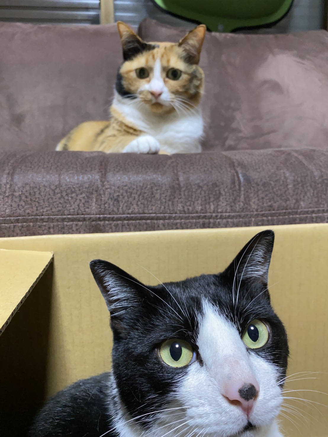 先住のいごちゃんが「ん???なにこれ?」って覗いています。